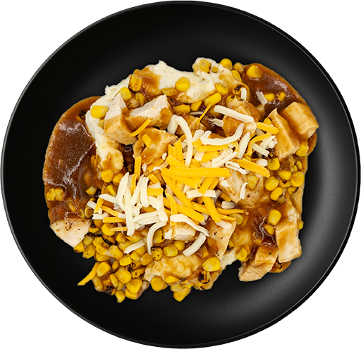 Tender grilled chicken served over creamy mashed potatoes, layered with sweet corn, and finished with a rich, savory onion gravy for the perfect comfort meal.
